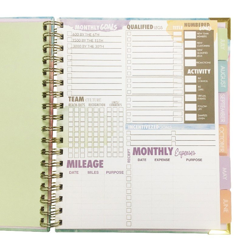 Personal weekly plannerSize: 148mm x 210mmSheet: 200 sheets = 400 pagesCover: hard card as cover + colorful printing + pocket Inner sheets: high-quality wood free paper, 4C x 4CTab: Mylar, glossy laminatedBinding: sewing bound Packaing : lid & bottom gift box